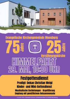 An Himmelfahrt, dem 29. Mai feiert die Gemeinde einen Festgottesdienst anläßlich des 25jöhrigen Bestehens der Versöhnungskirche in Moosburg und gleichzeitig 75 Jahre Evangelisch-lutherische Kirchengemeinde Moosburg.